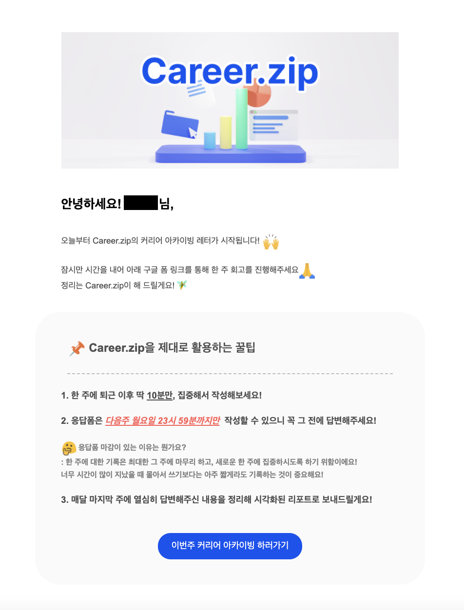 매주 금요일 커리어 아카이빙 질문지를 받고, 업무 내용을 기록해보세요! 커리어 정리는 커리어집이 해드립니다.