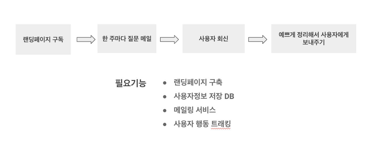 프로토타입의 워크플로우는 아래와 같다. 사용자가 랜딩페이지에서 이메일 구독 신청을 하면 한 주에 한 번씩 질문 리스트를 가지고 있는 구글폼 링크를 메일로 보내준다. 사용자는 구글 폼에 응답하여 커리어에 대해 기록할 수 있도록 하는 간단한 프로토 타입이었다.