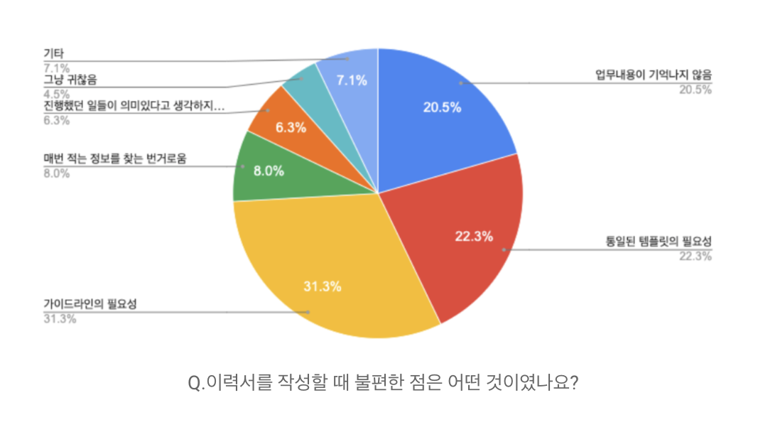 - 커리어를 정리하는데 어려움을 겪는 사람이 많다. → 기억이 나지 않아 어려움을 겪는 경우는 전체의 20%를 차지하며, 3번째로 높았다.