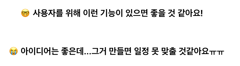 당연히 개발을 진행하다보면 새로운 아이디어들이 떠오르기 마련이지만, 우리가 세운 이 기준에 부합하지 않는다면 과감히 빼기로 결정했다.