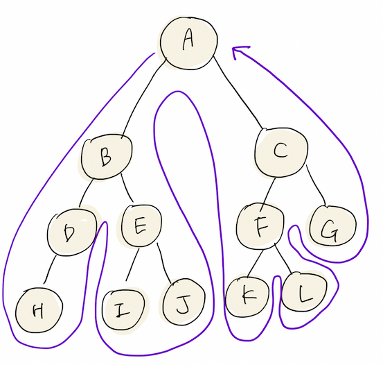 후위 순회로 DFS: H → D → I → J → E → B → K → L → F → G → C → A