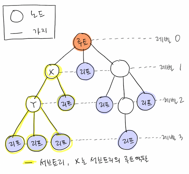- 서브트리(subtree): 트리 안에서 다시 어떤 노드를 루트로 정하고 그 자손으로 이루어진 트리를 서브 트리(subtree)라고 한다.