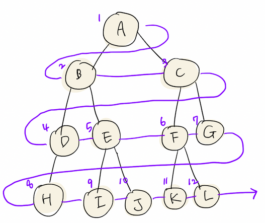 - 너비우선 탐색(Breadth-First Search): 낮은 레벨에서 시작해 왼쪽에서 오른쪽 방향으로 검색하고, 한 레벨의 검색이 끝나면 다음 레벨로 넘어간다.