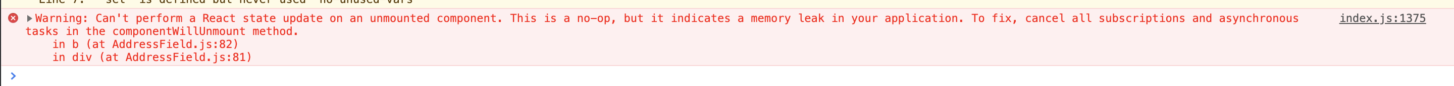 경고메세지는 unmount 된 컴포넌트에서 setState를 시도하기 때인데, 나의 경우는 DaumPostCode 컴포넌트 때문에 발생하였다. 상위 div를 클릭하면 handleShowAddSearch가 실행되어 addSearchVisible state를 true로 바꿔서 addSearchVisible = true 일때만 아래의 컴포넌트들이 보여질 수 있도록 하였다. 그리고 <DaumPostCode>에서 autoClose={true}를 주어 주소 검색이 완료되었을 때 <DaumPostCode> 컴포넌트의 내부에서 setState를 이용해 display: none으로 바꾼다. 하지만 이미 검색이 끝난 시점에 onComplete = {handleAddress} 내부에서 this.setState({addSearchVisible: false})로 현재 컴포넌트의 state를 변경 해주기 때문에 addSearchVisible=false가 되어 <DaumPostCode>는 mount가 안된다. 하지만 그제서야 <DaumPostCode> 내부에서 autoClose를 위해 setState({ display: 'none' })을 해주기 때문에 이러한 경고 메세지가 발생하였다.