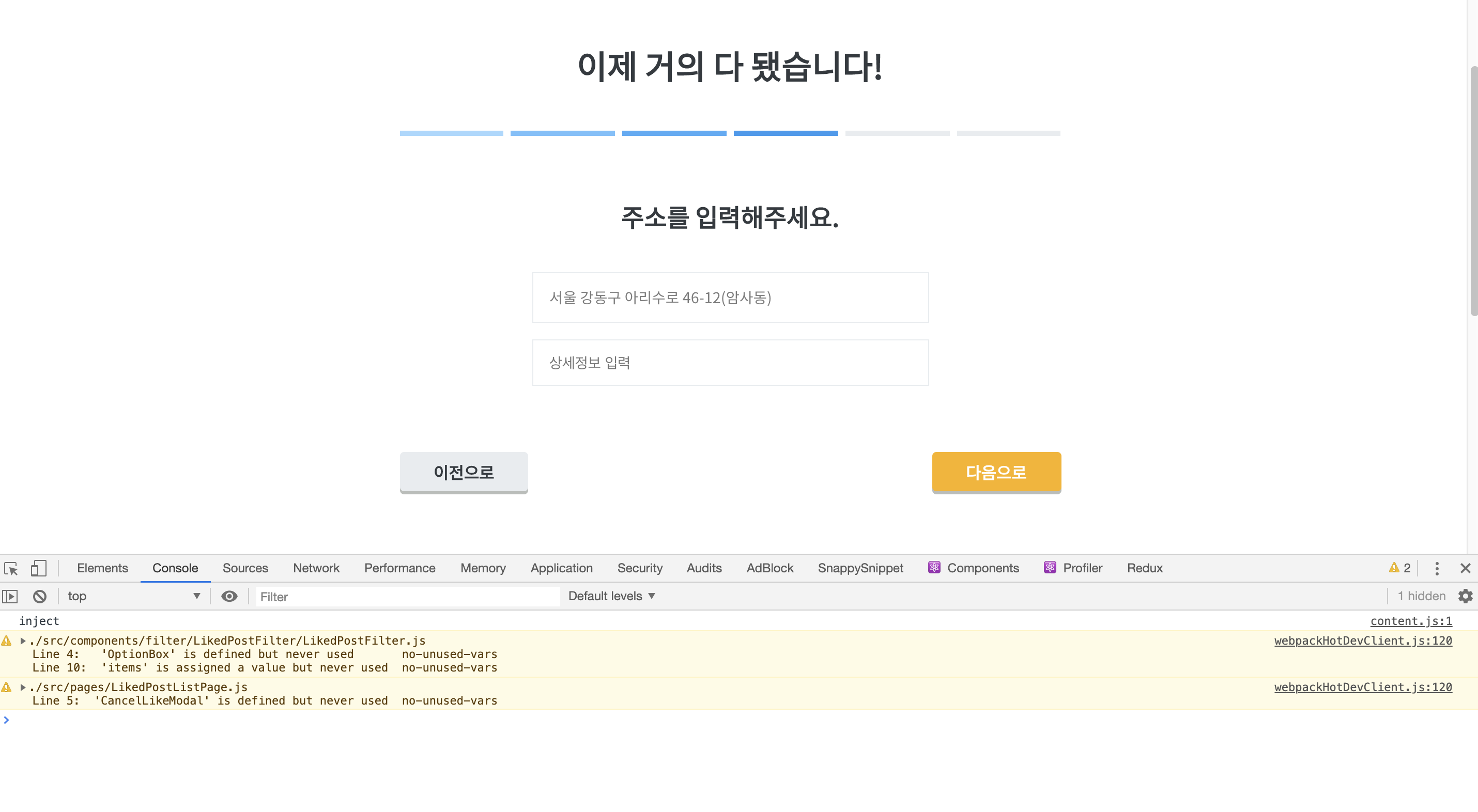 주소 입력은 주소 검색 div를 누르면 다음 주소검색 컴포넌트가 뜨도록 해서 검색할 수 있게 만들었다. 다만 컴포넌트로 넣었을 때 콘솔창에 아래와 같은 경고 메세지가 떴다.